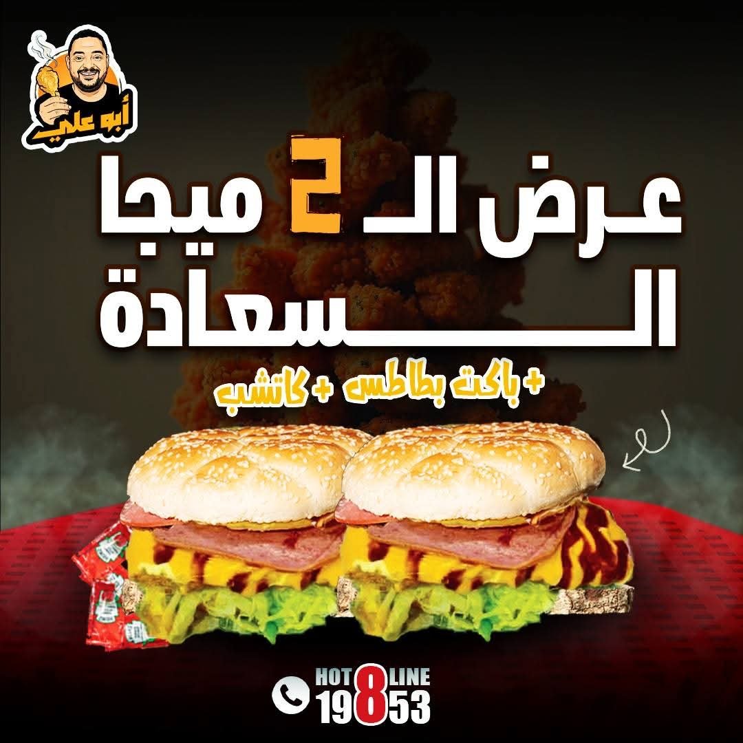 2 شريحة زنجر ٤٠٠ جرام + شريحة تركي مدخن + موتزاريلا ستيكس + حلقات بصل مقلية + خس + صوصات أبو علي المميزة