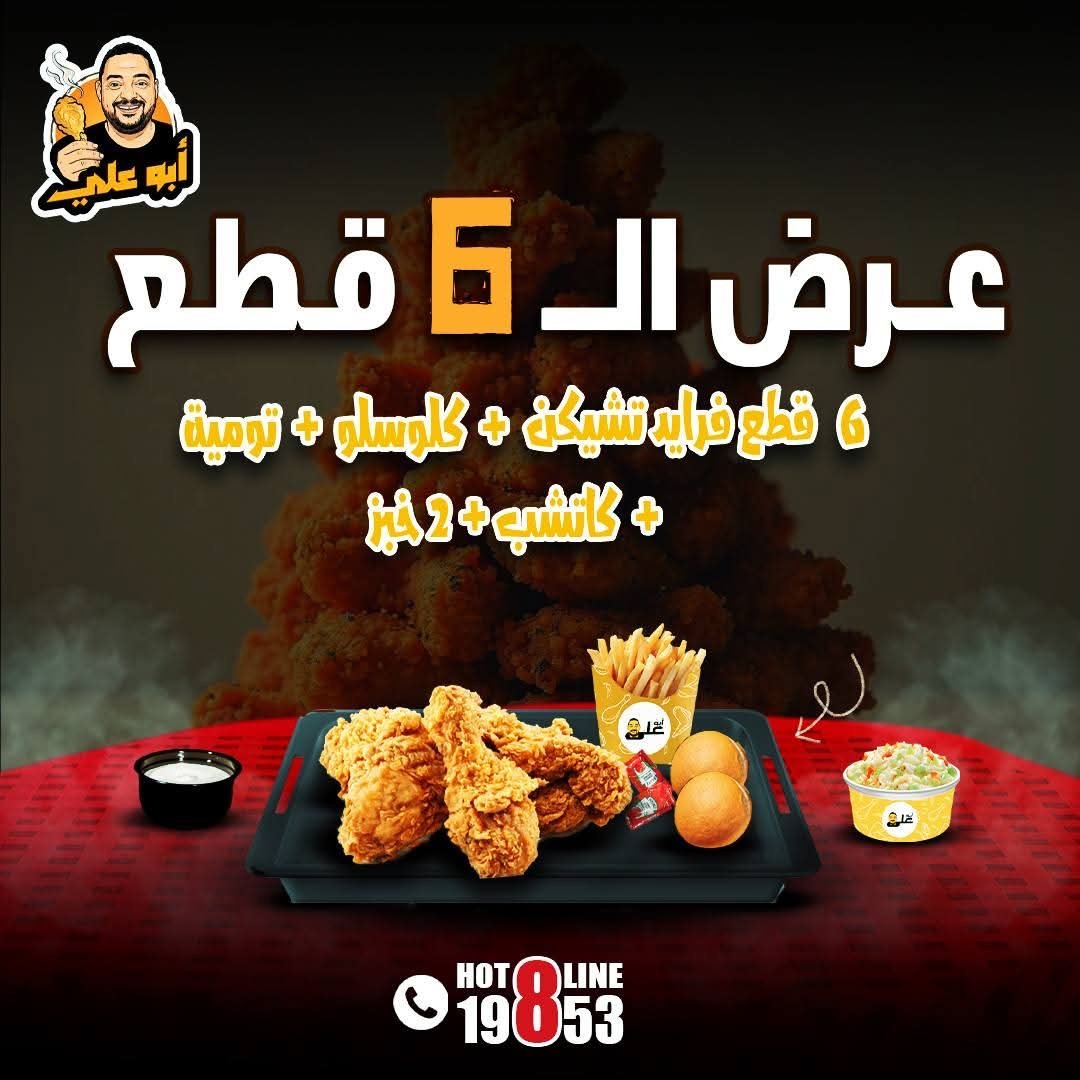 6 قطع فرايد تشيكن، 6 قطع كرسبي ستربس، أرز خلطة أبو علي، 2 تومية، 2 كولسلو، بطاطس جبنة، 4 خبز، كاتشب.