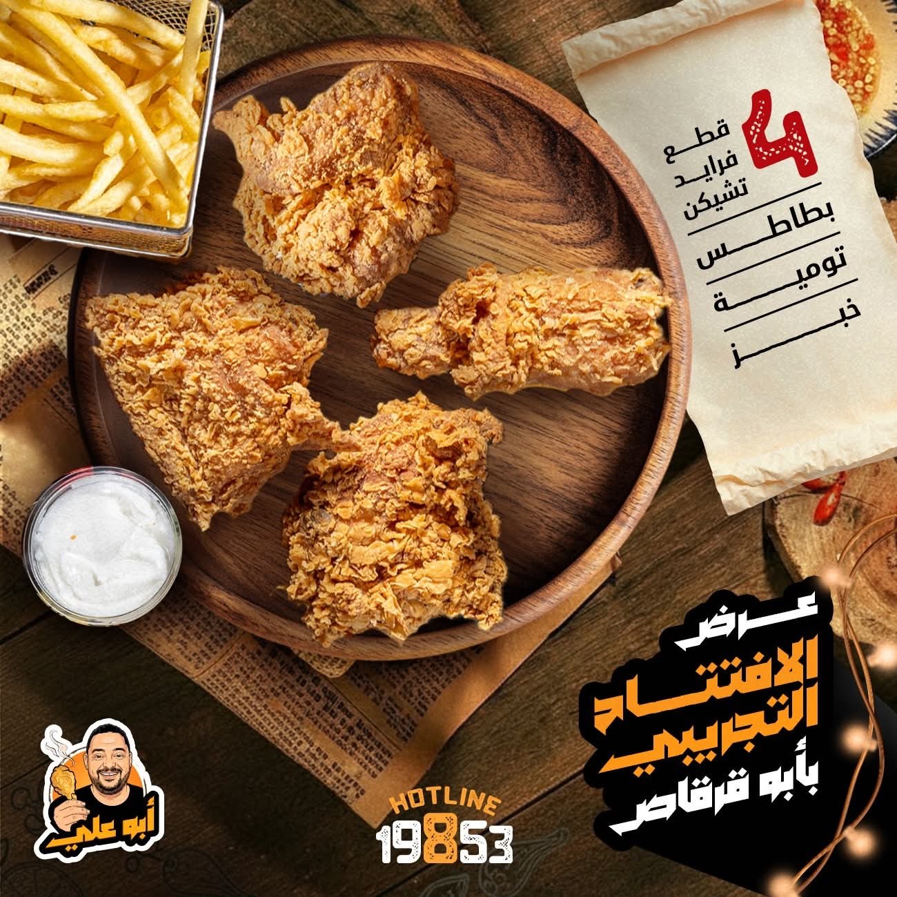الوصف: 4 قطع فراخ تشيكن + 4 قطع كرسبي ستربس + أرز بخلطة أبو علي + بطاطس جبنة + كولسلو وسط + تومية وسط + كاتشب + 2 خبز
