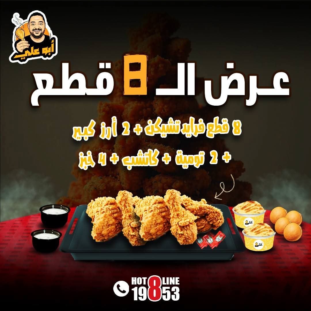 8 قطع فرايد تشيكن، أرز خلطة أبو علي، 1 تومية وسط، كولسلو وسط، بطاطس جبنة سموكد ، 4 خبز، لتر مشروب .
